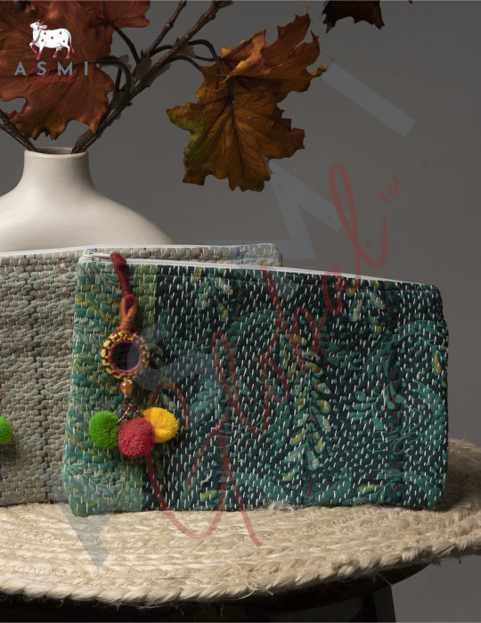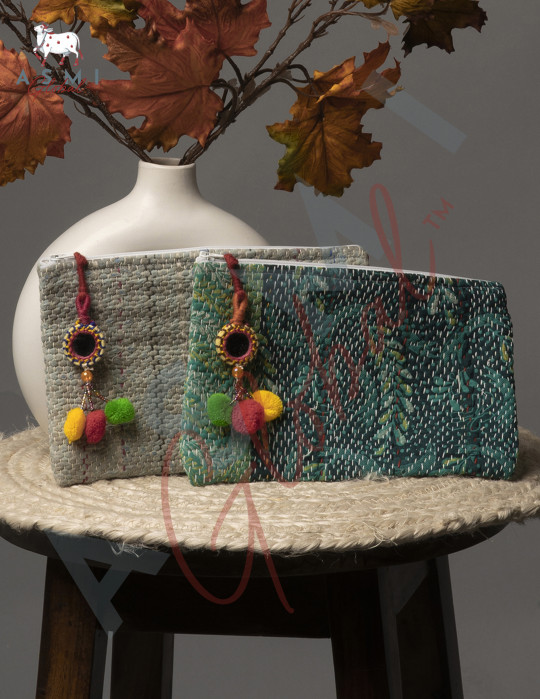 Beautiful pouch with Kantha work and a pom-pom tassled zip with mirror, bead and embroidery work.