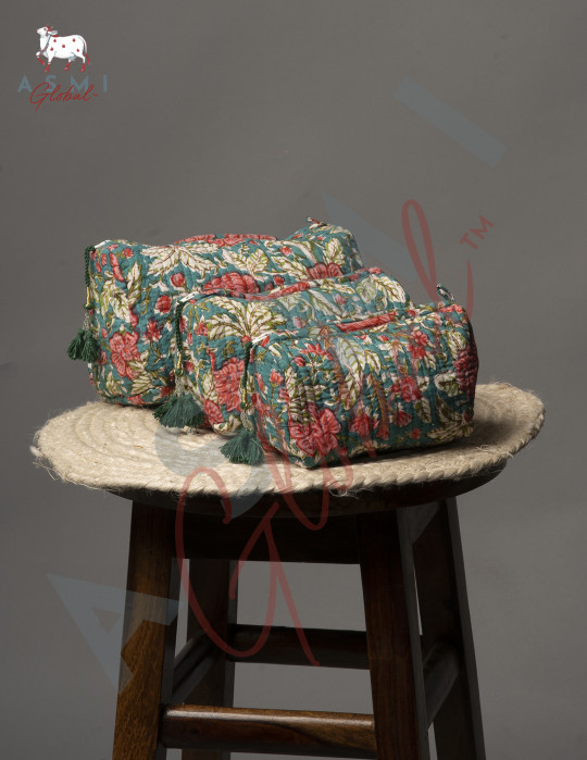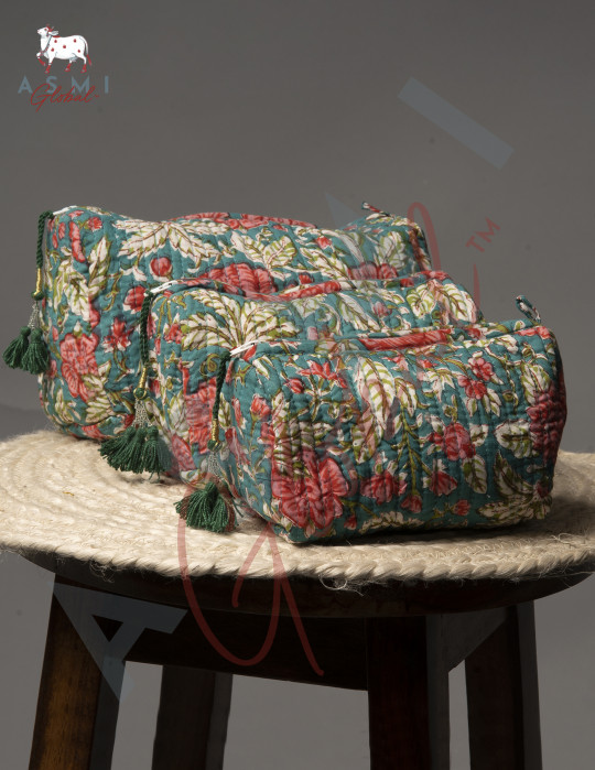 Our quilted wash bag range in beautiful hand block prints is designed to keep all things you need. It is easy to carry and use and fits well in bags. Its inner pockets make for a great organizer and a perfect travel accessory bag. It has varied uses like a wash bag, toiletry bag, cosmetic bag, shaving bag, etc.